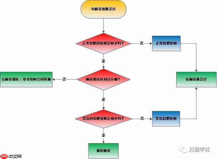 周末一到,来洗浴中心的顾客比平时多了几倍,想做足疗的顾客排队时间过长,顾客们已经不耐烦了。老王马上做出反应,从其他洗浴中心紧急招聘了五名足疗技师,为队伍里的顾客做足疗,大大减少了排队时间。不过,有时生意太火爆,紧急招聘的技师也忙不过来,顾客排队时间还是很长,新的顾客来了,老王只能满脸赔笑地说:“您下次再来吧,下次给您找个好技师。”,把顾客拒之门外。周末过后,店里不能养闲人,老王就把紧急招聘的技师都辞退了。