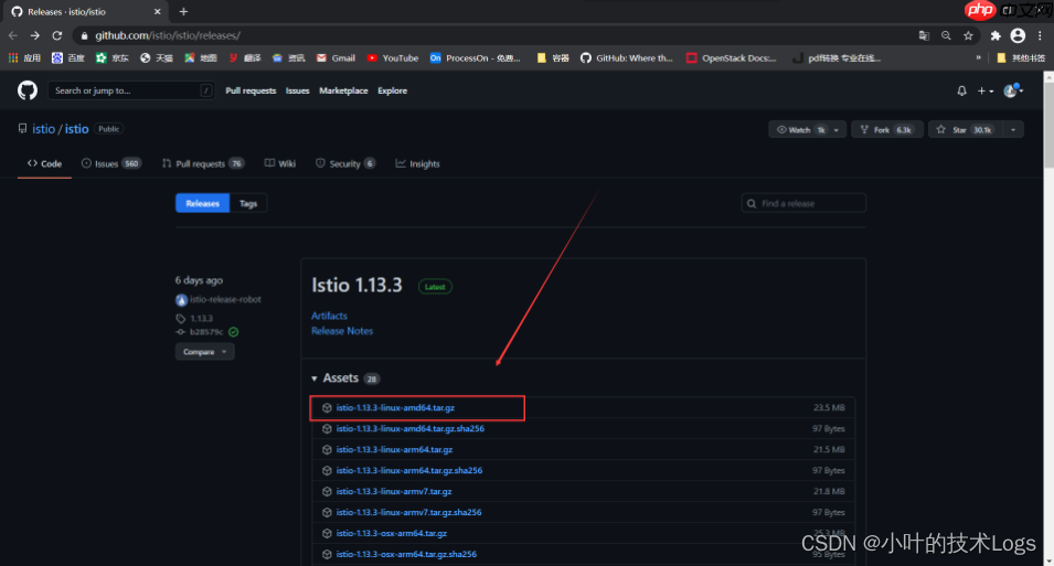 挑选对应的istio版本、下载对应的压缩文件,如图所示: