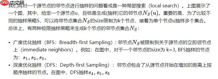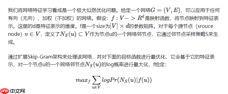 基于skip-gram的特征学习方法,最早源自于NLP上下文学习。文本本身是线性的,一个邻词可以很自然地使用一个在连续词汇上的滑动窗口进行定义。而对于网络,是非线性的,因此需要更丰富。为了解决这一点,论文提出了一种随机过程,它会对给定源节点u抽样许多不同的邻节点。