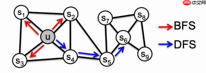 随机游走直觉上,参数p和q控制着该walk从起始节点u进行探索和离开邻节点的快慢。特别的,该参数允许我们的搜索过程(近似)在BFS和DFS间进行插值,从而影响不同节点等价的紧密关系。
