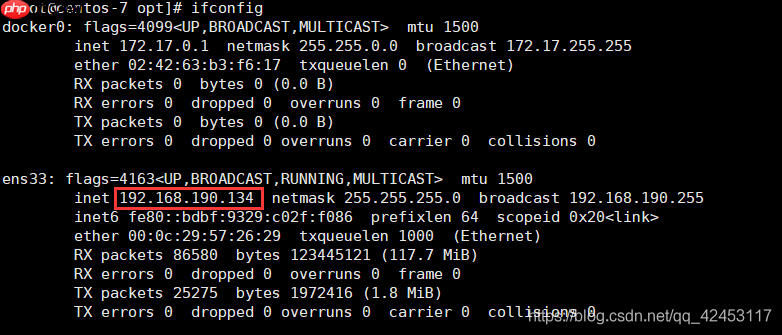 您可以看到httpd的默认端口号是80。接下来,使用ifconfig命令获取虚拟机的IP地址: