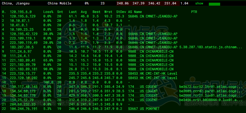 Traceroute to China, Guangzhou CM (TCP Mode, Max 30 Hop)============================================================traceroute to 120.196.212.25 (120.196.212.25), 30 hops max, 32 byte packets1 107.189.0.1 0.23 ms AS53667 Luxembourg, buyvm.net2 172.18.9.5 1.63 ms * LAN Address3 184.104.194.110 5.72 ms AS6939 Belgium, Brussels–Capital Region, Brussels, he.net4 *5 72.52.92.113 81.24 ms AS6939 United States, New York, New York City, he.net6 *7 *8 184.105.81.218 141.73 ms AS6939 United States, California, San Jose, he.net9 184.105.64.4 143.48 ms AS6939 United States, Georgia, Atlanta, he.net10 *11 223.120.6.69 206.07 ms AS58453 United States, California, San Jose, ChinaMobile12 *13 *14 221.183.52.85 293.65 ms AS9808 China, Guangdong, Guangzhou, ChinaMobile15 221.183.68.142 321.93 ms AS9808 China, Guangdong, Guangzhou, ChinaMobile16 111.24.5.177 322.78 ms AS9808 China, Guangdong, Guangzhou, ChinaMobile17 111.24.5.222 299.31 ms AS9808 China, Guangdong, Shenzhen, ChinaMobile18 *19 211.136.214.142 306.39 ms AS56040 China, Guangdong, Guangzhou, ChinaMobile20 *21 *22 120.196.212.25 299.54 ms AS56040 China, Guangdong, Guangzhou, ChinaMobile Traceroute to China, Shanghai CM (TCP Mode, Max 30 Hop)============================================================traceroute to 221.183.55.22 (221.183.55.22), 30 hops max, 32 byte packets1 *2 204.68.252.34 0.59 ms * Luxembourg, cogentco.com3 154.25.12.69 1.39 ms AS174 Luxembourg, cogentco.com4 154.54.63.85 7.95 ms AS174 France, Ile–de–France, Paris, cogentco.com5 154.54.57.69 17.52 ms AS174 United Kingdom, London, cogentco.com6 154.54.82.34 76.99 ms AS174 United States, Massachusetts, Boston, cogentco.com7 154.54.0.221 80.76 ms AS174 COGENTCO.COM 骨干网, cogentco.com8 *9 154.54.6.221 97.60 ms AS174 United States, Illinois, Chicago, cogentco.com10 154.54.42.165 109.22 ms AS174 United States, Missouri, Kansas City, cogentco.com11 154.54.31.89 120.47 ms AS174 COGENTCO.COM 骨干网, cogentco.com12 *13 154.54.44.137 145.10 ms AS174 United States, California, San Francisco, cogentco.com14 154.54.43.10 146.45 ms AS174 United States, California, San Jose, cogentco.com15 *16 223.120.6.69 182.40 ms AS58453 United States, California, San Jose, ChinaMobile17 *18 *19 *20 *21 *22 *23 *24 *25 *26 *27 *28 *29 *30 * Traceroute to China, Beijing CM (TCP Mode, Max 30 Hop)============================================================traceroute to 211.136.25.153 (211.136.25.153), 30 hops max, 32 byte packets1 107.189.0.1 0.37 ms AS53667 Luxembourg, buyvm.net2 *3 184.104.194.110 5.71 ms AS6939 Belgium, Brussels–Capital Region, Brussels, he.net4 *5 72.52.92.113 81.32 ms AS6939 United States, New York, New York City, he.net6 *7 *8 184.105.81.218 141.42 ms AS6939 United States, California, San Jose, he.net9 184.105.64.4 142.14 ms AS6939 United States, Georgia, Atlanta, he.net10 216.218.132.102 180.20 ms AS6939 United States, California, Fremont, he.net11 223.120.6.69 209.07 ms AS58453 United States, California, San Jose, ChinaMobile12 *13 *14 221.183.46.250 285.11 ms AS9808 China, Beijing, ChinaMobile15 *16 111.24.14.46 301.50 ms AS9808 China, Beijing, ChinaMobile17 *18 *19 *20 211.136.95.226 306.03 ms AS56048 China, Beijing, ChinaMobile21 *22 *23 211.136.25.153 289.82 ms AS56048 China, Beijing, ChinaMobile