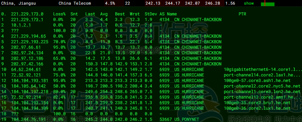 Traceroute to China, Guangzhou CT (TCP Mode, Max 30 Hop)============================================================traceroute to 113.108.209.1 (113.108.209.1), 30 hops max, 32 byte packets1 107.189.0.1 0.45 ms AS53667 Luxembourg, buyvm.net2 172.18.9.5 1.77 ms * LAN Address3 *4 *5 *6 184.104.197.217 16.57 ms AS6939 United Kingdom, London, he.net7 118.85.205.25 21.21 ms AS4134 United Kingdom, London, ChinaTelecom8 *9 *10 202.97.72.1 252.66 ms AS4134 China, Guangdong, Guangzhou, ChinaTelecom11 *12 113.108.209.1 252.71 ms AS4134 China, Guangdong, Guangzhou, ChinaTelecom Traceroute to China, Shanghai CT (TCP Mode, Max 30 Hop)============================================================traceroute to 180.153.28.5 (180.153.28.5), 30 hops max, 32 byte packets1 107.189.0.1 0.33 ms AS53667 Luxembourg, buyvm.net2 172.18.9.5 1.97 ms * LAN Address3 184.104.194.110 5.57 ms AS6939 Belgium, Brussels–Capital Region, Brussels, he.net4 *5 *6 184.104.197.217 15.65 ms AS6939 United Kingdom, London, he.net7 118.85.205.25 16.14 ms AS4134 United Kingdom, London, ChinaTelecom8 *9 *10 *11 61.152.24.85 247.43 ms AS4812 China, Shanghai, ChinaTelecom12 124.74.166.14 233.31 ms AS4812 China, Shanghai, ChinaTelecom13 101.95.225.218 235.34 ms AS4811 China, Shanghai, ChinaTelecom14 *15 *16 *17 *18 *19 *20 *21 *22 *23 *24 *25 *26 *27 *28 *29 *30 * Traceroute to China, Beijing CT (TCP Mode, Max 30 Hop)============================================================traceroute to 180.149.128.9 (180.149.128.9), 30 hops max, 32 byte packets1 107.189.0.1 0.20 ms AS53667 Luxembourg, buyvm.net2 172.18.9.5 1.98 ms * LAN Address3 184.104.194.110 5.93 ms AS6939 Belgium, Brussels–Capital Region, Brussels, he.net4 *5 *6 184.104.197.217 15.65 ms AS6939 United Kingdom, London, he.net7 118.85.205.25 15.78 ms AS4134 United Kingdom, London, ChinaTelecom8 *9 *10 *11 *12 *13 *14 *15 *16 *17 *18 *19 *20 *21 *22 *23 *24 *25 *26 *27 *28 *29 *30 *