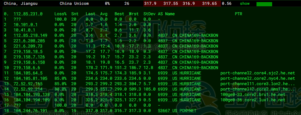 Traceroute to China, Guangzhou CU (TCP Mode, Max 30 Hop)============================================================traceroute to 210.21.4.130 (210.21.4.130), 30 hops max, 32 byte packets1 *2 172.18.9.5 1.55 ms * LAN Address3 184.104.194.110 5.40 ms AS6939 Belgium, Brussels–Capital Region, Brussels, he.net4 *5 72.52.92.113 81.30 ms AS6939 United States, New York, New York City, he.net6 *7 *8 72.52.92.122 140.71 ms AS6939 United States, California, Los Angeles, he.net9 72.52.93.38 306.41 ms AS6939 United States, California, Los Angeles, he.net10 219.158.96.33 295.85 ms AS4837 China, Guangdong, Guangzhou, ChinaUnicom11 219.158.4.77 304.50 ms AS4837 China, Guangdong, ChinaUnicom12 219.158.3.17 316.91 ms AS4837 China, Guangdong, ChinaUnicom13 112.91.0.254 316.72 ms AS17816 China, Guangdong, Guangzhou, ChinaUnicom14 120.80.91.66 317.99 ms AS17816 China, Guangdong, Guangzhou, ChinaUnicom15 *16 *17 *18 *19 *20 *21 *22 *23 *24 *25 *26 *27 *28 *29 *30 * Traceroute to China, Shanghai CU (TCP Mode, Max 30 Hop)============================================================traceroute to 58.247.8.158 (58.247.8.158), 30 hops max, 32 byte packets1 *2 172.18.9.5 1.98 ms * LAN Address3 184.104.194.110 8.23 ms AS6939 Belgium, Brussels–Capital Region, Brussels, he.net4 *5 72.52.92.113 81.31 ms AS6939 United States, New York, New York City, he.net6 *7 *8 72.52.92.122 141.29 ms AS6939 United States, California, Los Angeles, he.net9 72.52.93.38 309.50 ms AS6939 United States, California, Los Angeles, he.net10 219.158.97.209 304.38 ms AS4837 China, Guangdong, Guangzhou, ChinaUnicom11 219.158.96.206 311.33 ms AS4837 China, Guangdong, Guangzhou, ChinaUnicom12 *13 219.158.100.201 322.59 ms AS4837 China, Shanghai, ChinaUnicom14 *15 139.226.228.46 299.56 ms AS17621 China, Shanghai, ChinaUnicom16 *17 *18 *19 *20 *21 *22 *23 *24 *25 *26 *27 *28 *29 *30 * Traceroute to China, Beijing CU (TCP Mode, Max 30 Hop)============================================================traceroute to 123.125.99.1 (123.125.99.1), 30 hops max, 32 byte packets1 107.189.0.1 59.56 ms AS53667 Luxembourg, buyvm.net2 204.68.252.34 0.55 ms * Luxembourg, cogentco.com3 154.25.12.69 1.88 ms AS174 Luxembourg, cogentco.com4 154.54.63.5 92.59 ms AS174 Germany, Hesse, Frankfurt, cogentco.com5 *6 149.11.182.250 258.53 ms AS174 Europe Regions, cogentco.com7 *8 *9 *10 *11 61.148.158.90 252.87 ms AS4808 China, Beijing, ChinaUnicom12 *13 *14 *15 *16 *17 *18 *19 *20 *21 *22 *23 *24 *25 *26 *27 *28 *29 *30 *