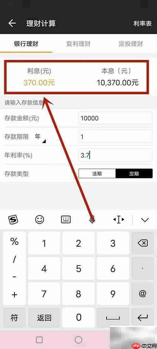 打开手机中的全能计算器,选择理财功能,输入本金与3.7%利率,提交后即可查看结果。
