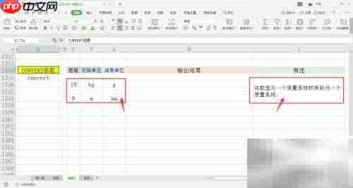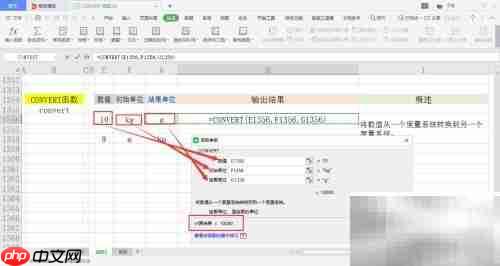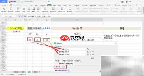 在弹出的对话框中需要输入三个参数:原始数值、起始单位和目标单位。这些参数既可以直接键入,也可以通过鼠标点击单元格来引用其内容。