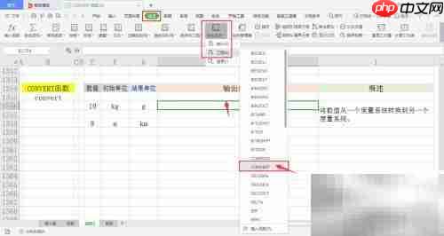 进入Excel菜单栏中的“公式”选项,选择“其他函数”下的“工程”类别,找到并点击CONVERT函数,然后选定一个目标单元格以显示转换结果。