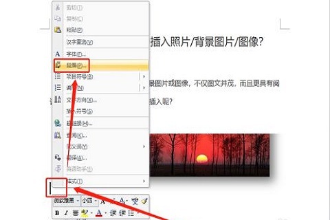 3、在或者点击插入图片位置,右键,在下拉菜单中点击段落。