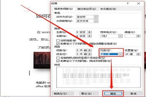 4、在弹出的段落设置窗口的缩进和间距项下,将行距设置为最小值,或者是想要的尺寸。
