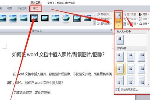 2、选择工具栏格式项,点击位置下拉箭头,根据需要,选择图片与文字的位置。