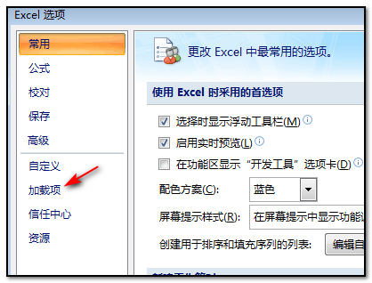 4、选择excel选项以后,在弹出的对话框中找到并点击加载项命令;