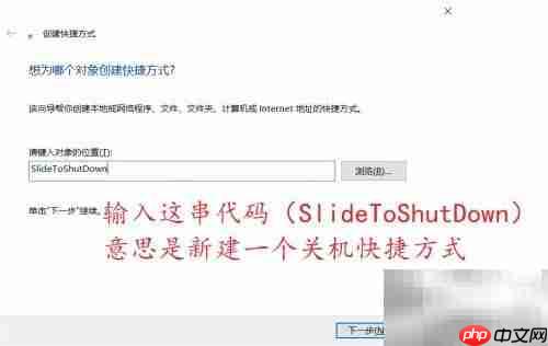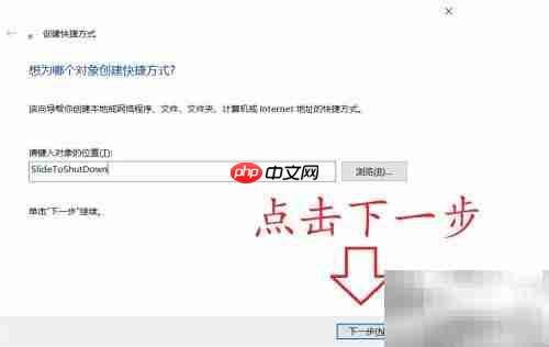 3、 在位置栏输入命令:SlideToShutDown,然后点击下一步。