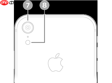 iPhone XR 后视图。后置摄像头和闪光灯位于左上方。 |
