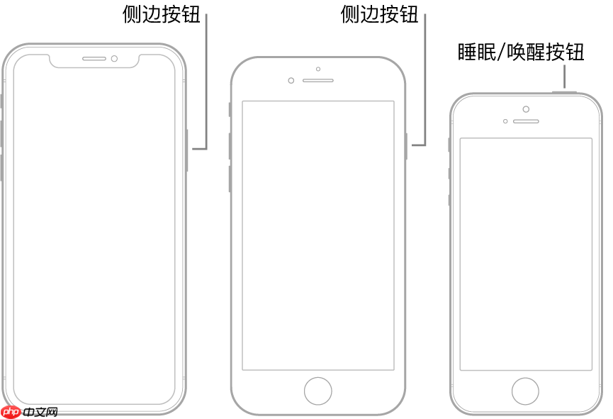不同 iPhone 机型上的侧边按钮或睡眠/唤醒按钮示意图。
