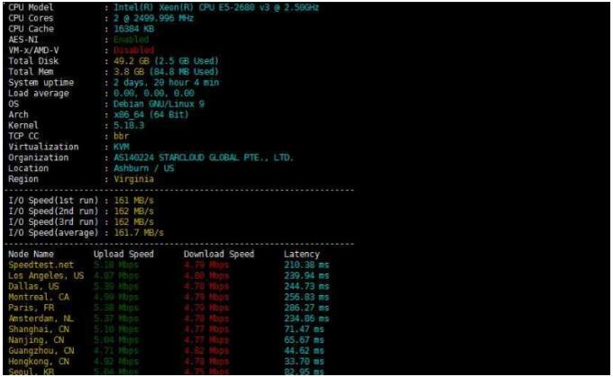 二、华纳云新加坡VPS云服务器速度和性能评测(2核4G5M 50G硬盘配置)