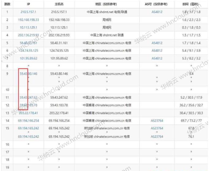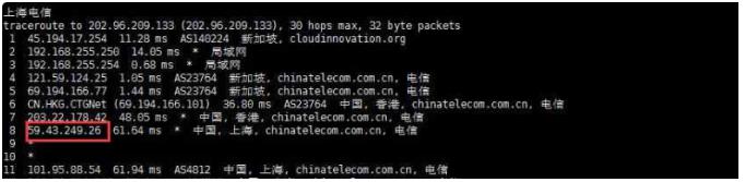 可以看到电信网络是经过香港节点,然后直连新加坡机房,并且走是是59.43的CN2 GIA线路。