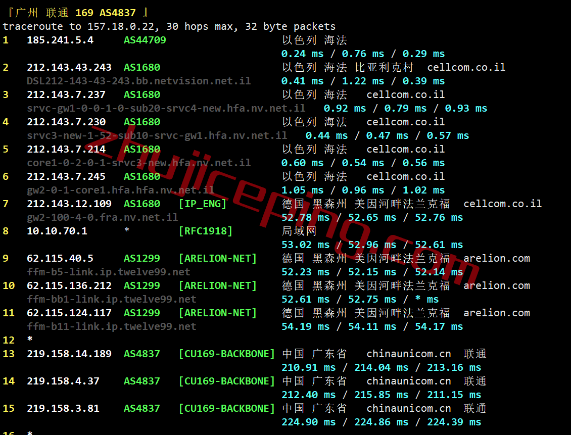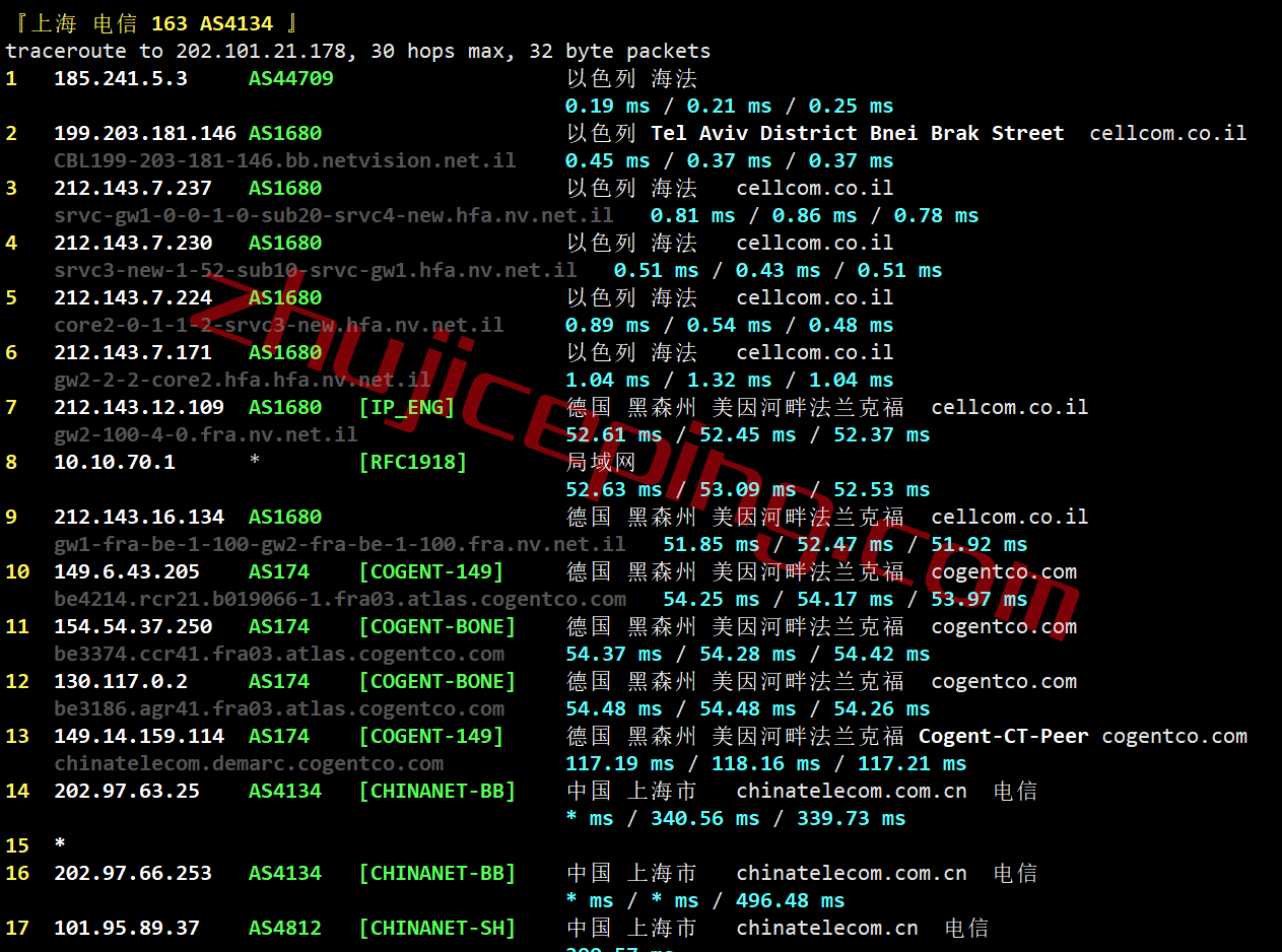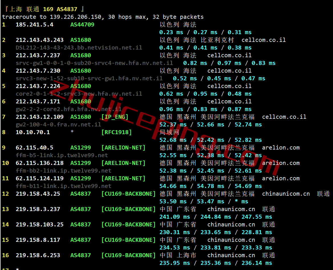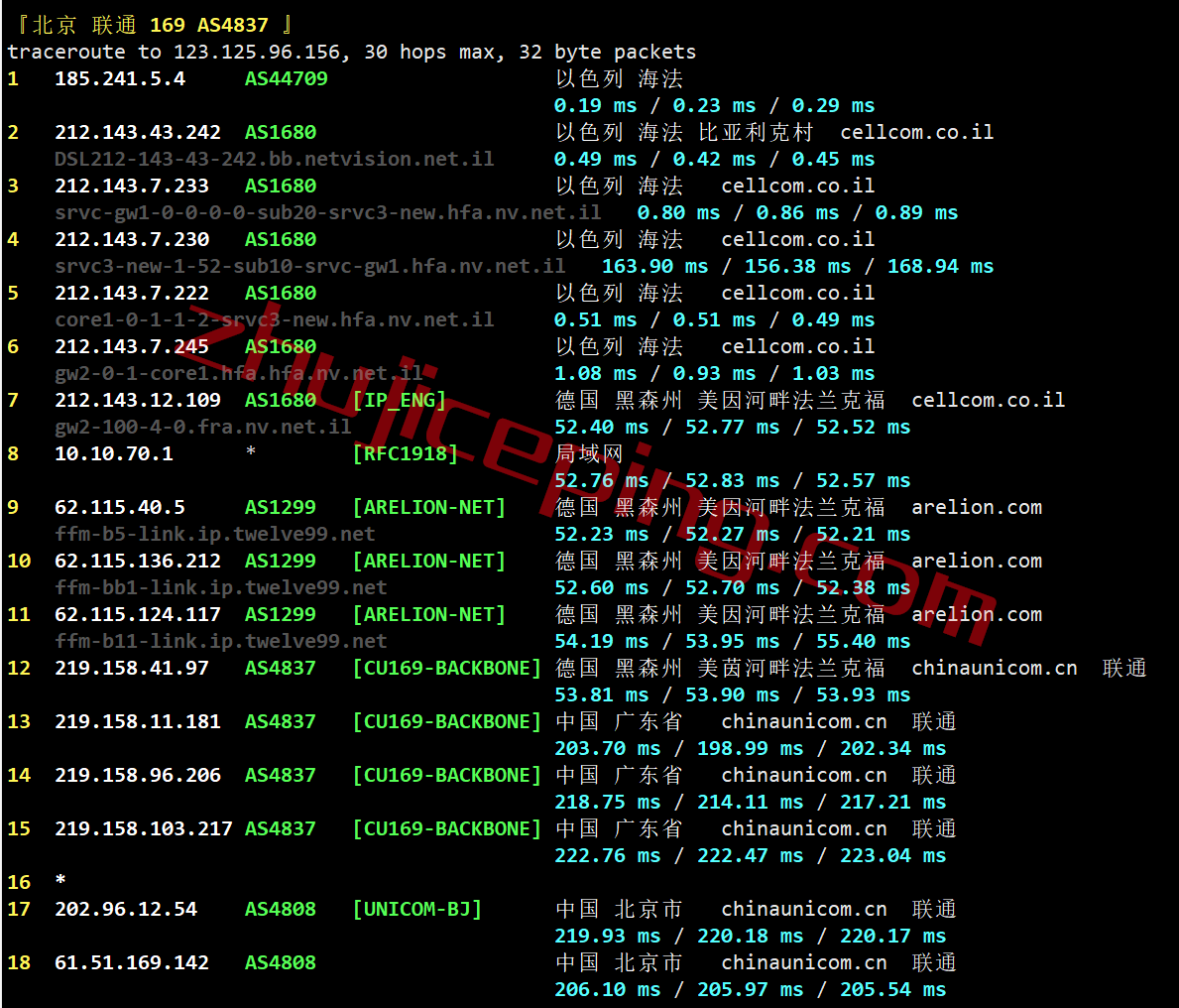 北京/上海方向:走cellcom.co.il接twelve99去德国法兰克福,从此处联通节点直连回国