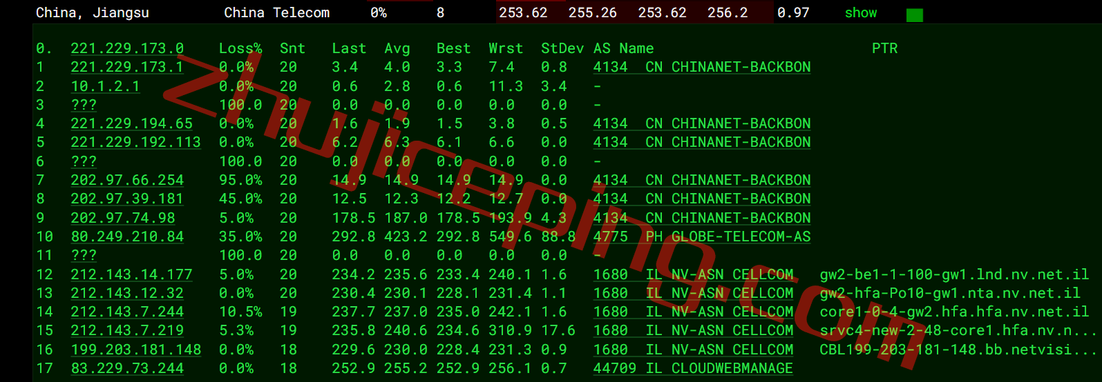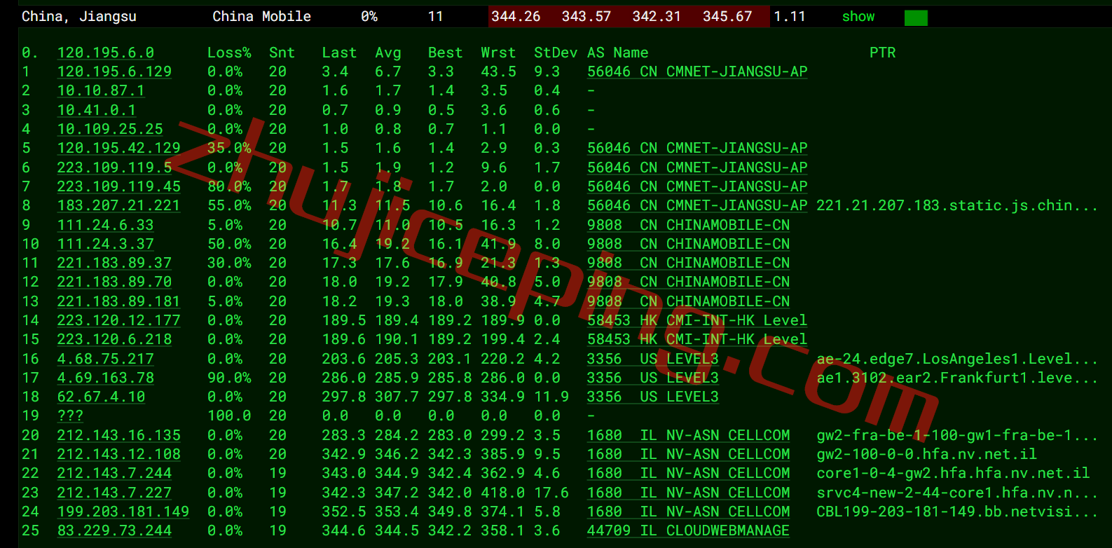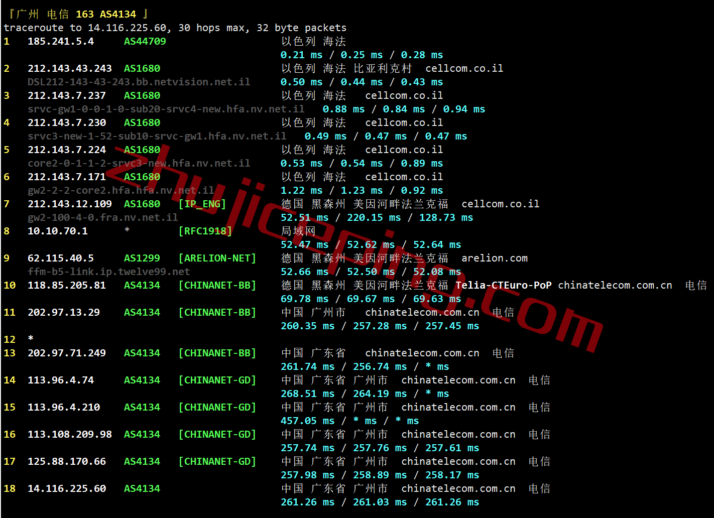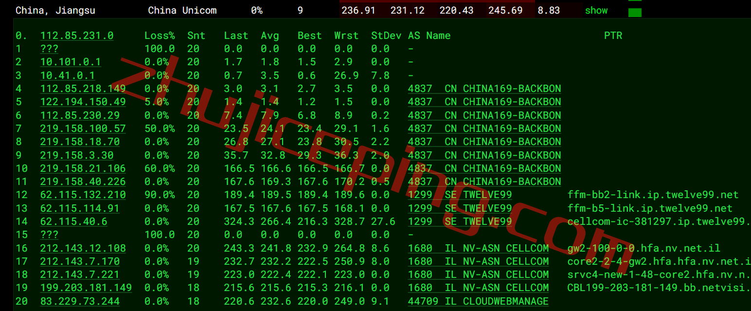 北京/上海方向:走cellcom.co.il接twelve99去德国法兰克福,从此处联通节点直连回国