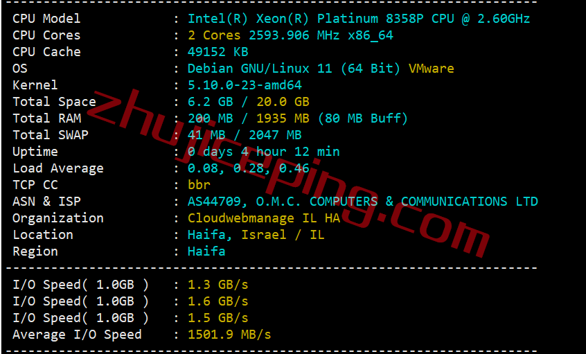 Intel Xeon Platinum 8358P(该CPU在2021年第二季度上市、32核、64线程、2.6GHz主频、3.4GHz加速频率),我们能看到云服务器底层是VMware,站长启用了BBR,归属地在以色列海法市,当前I/O大致在1501MB/S的样子: