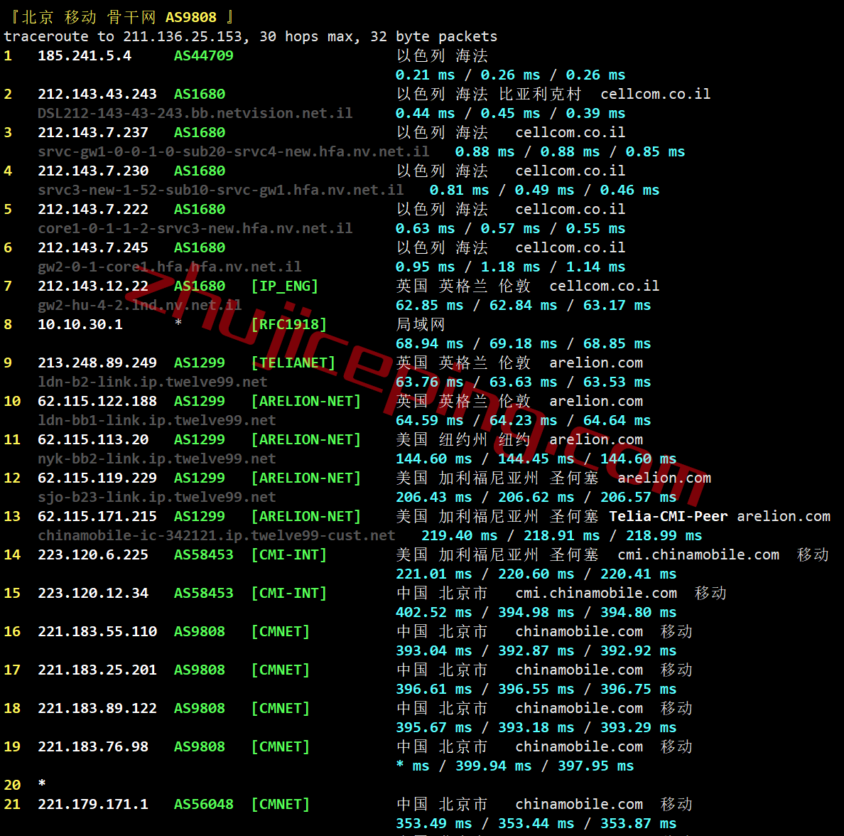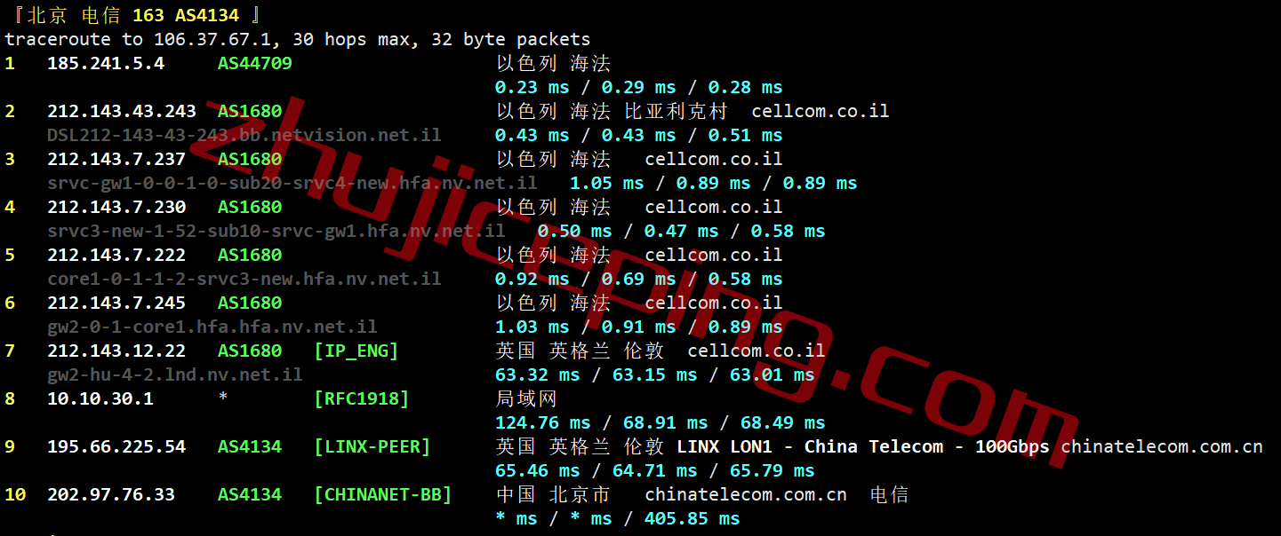 北京方向:走cellcom.co.il直接到英国伦敦,然后从电信伦敦节点直连回国