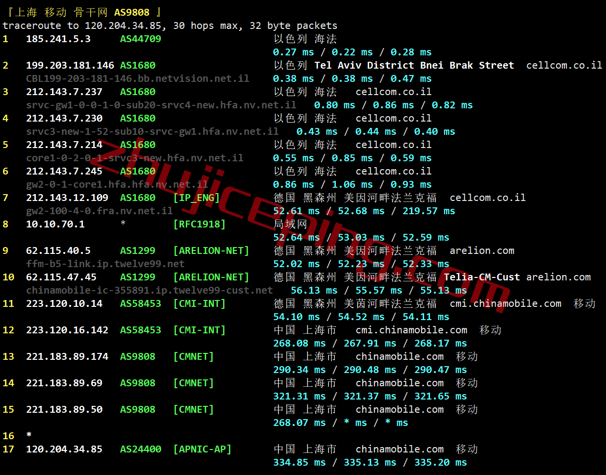 上海方向:走cellcom.co.il到德国转twelve99对接移动与twelve99在法兰克福的pop再从移动节点直连回国