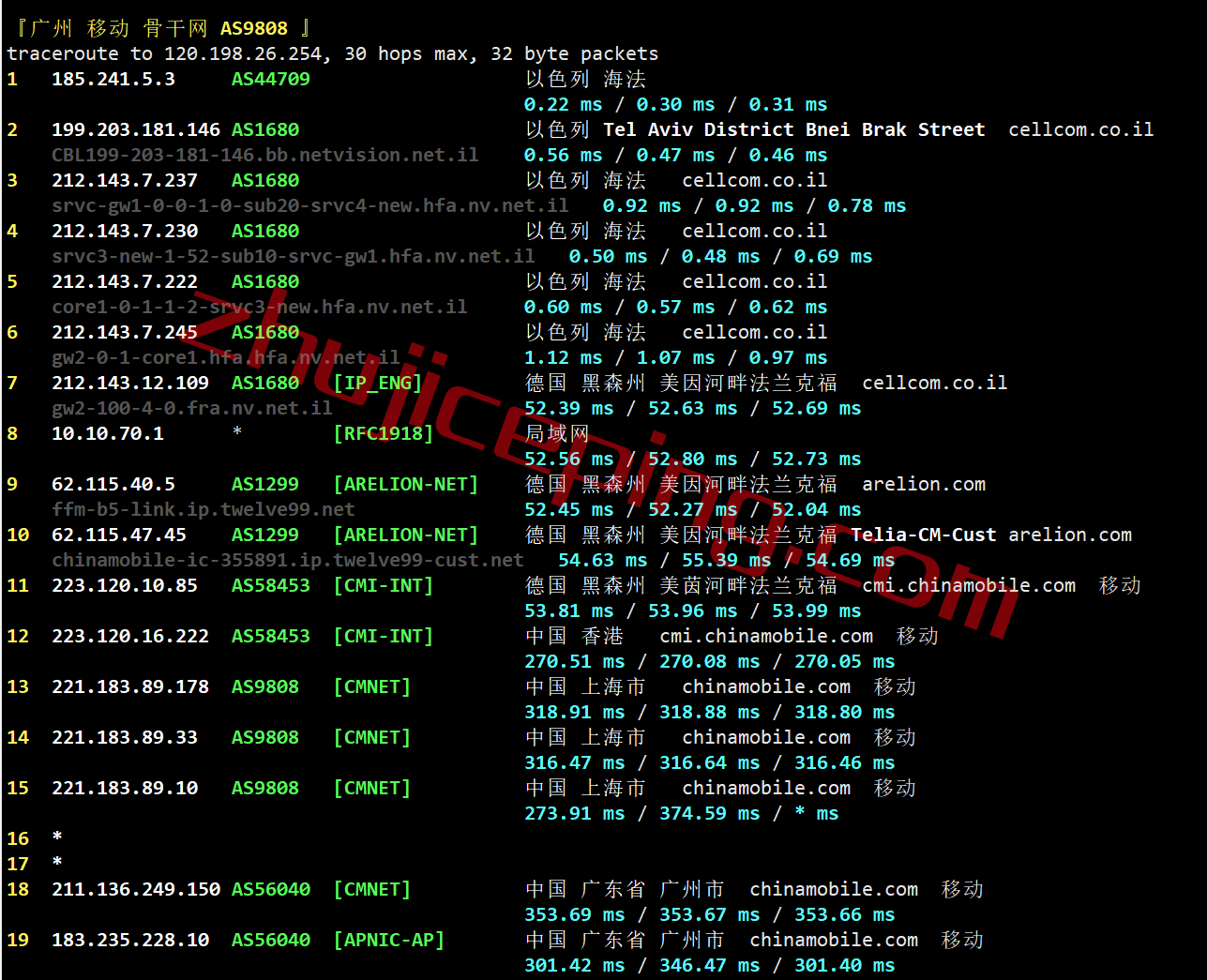 广州方向:走cellcom.co.il到德国转twelve99对接移动与twelve99在法兰克福的pop再从移动节点回香港,然后回国