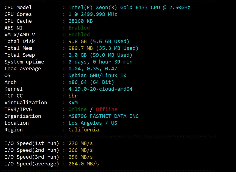 CPU型号为Xeon Gold 6133(20核40线程,2.5GHz),归属地洛杉矶,启用了BBR,当前I/O大致264MB/S: