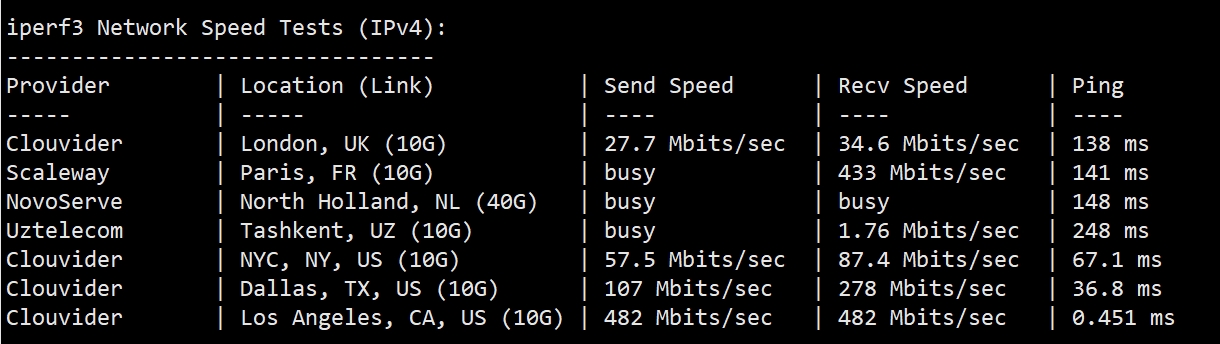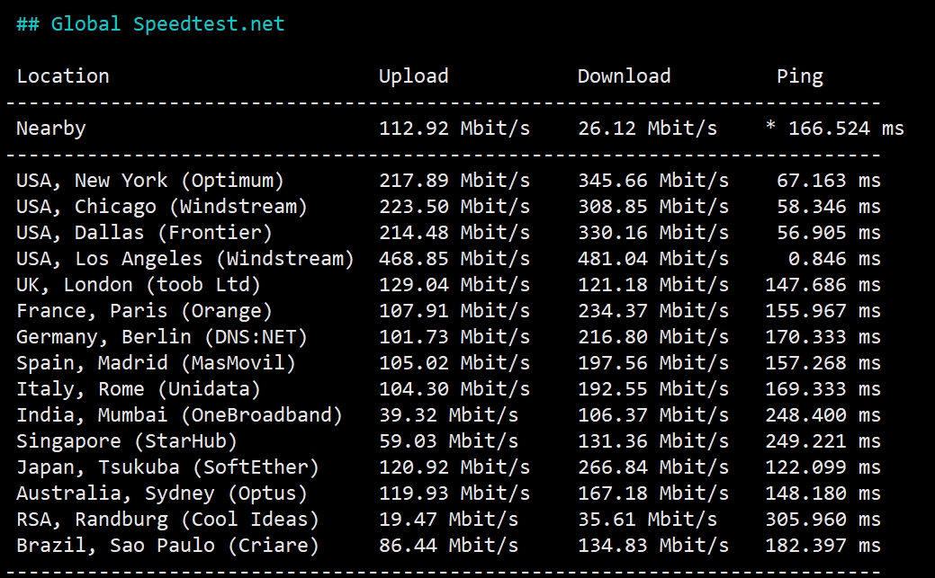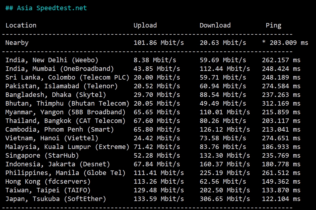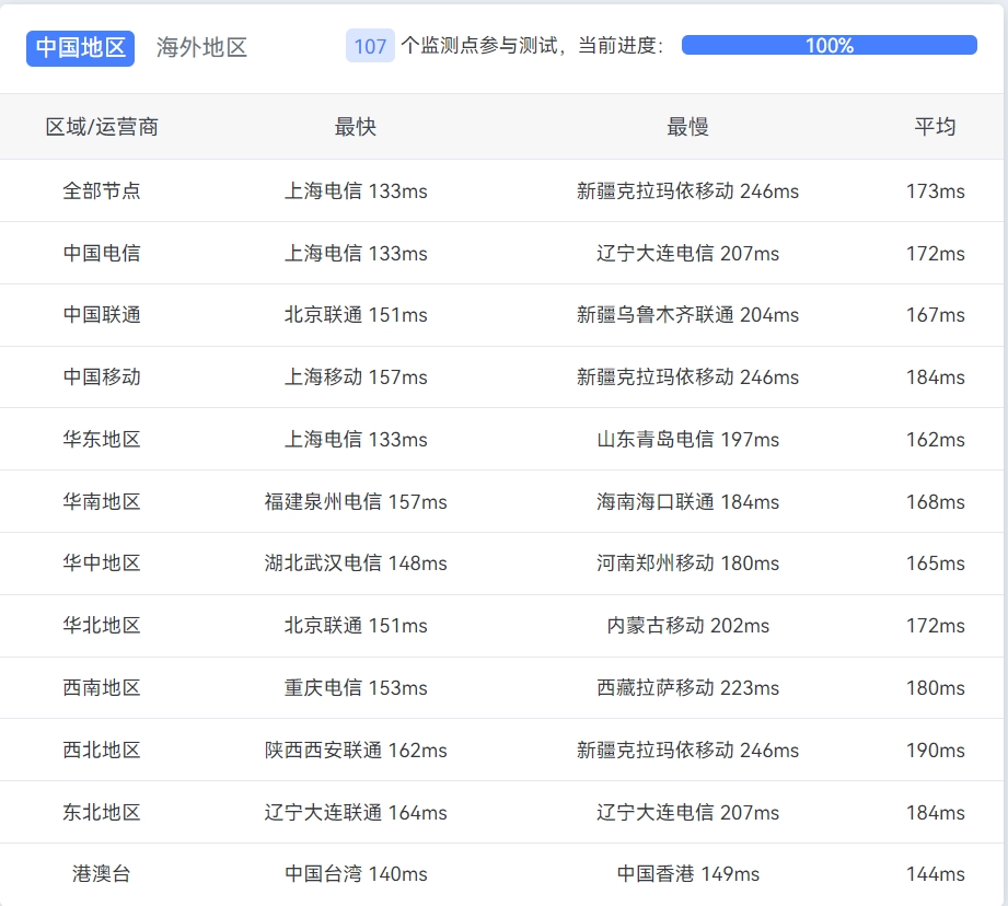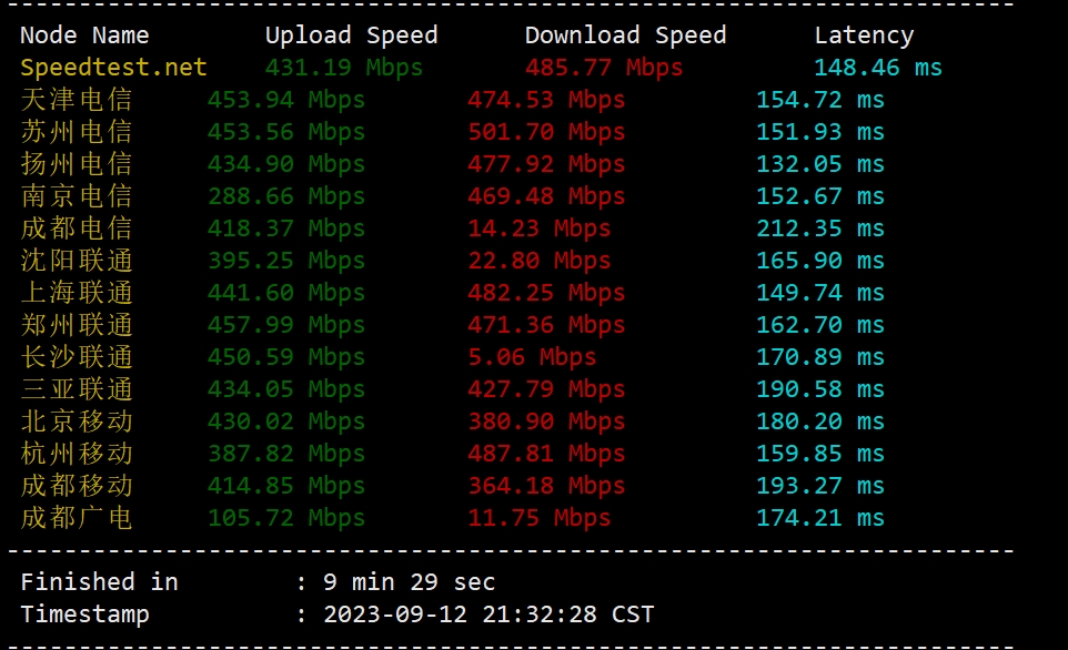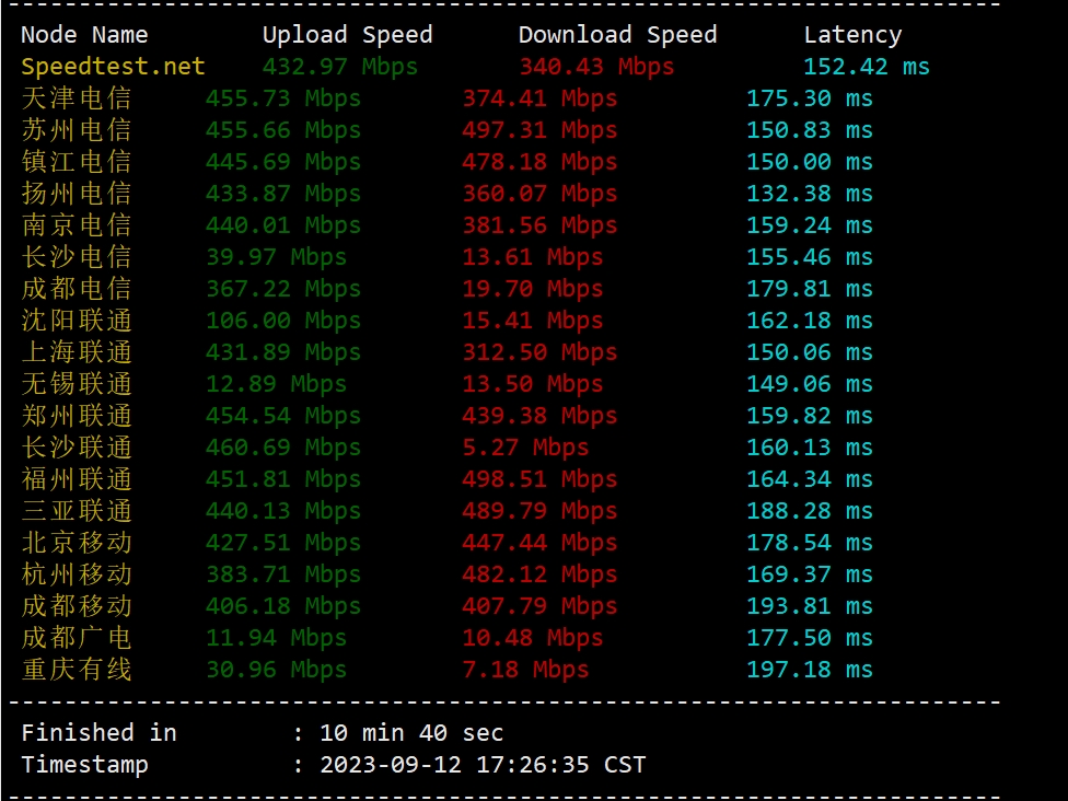 国内三网多节点来跑一圈上下行带宽测试,看看效果: