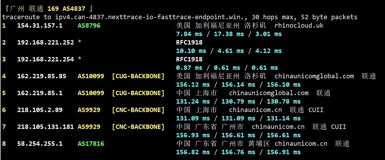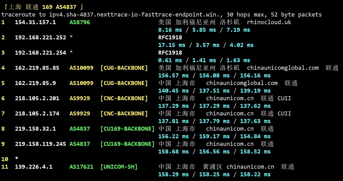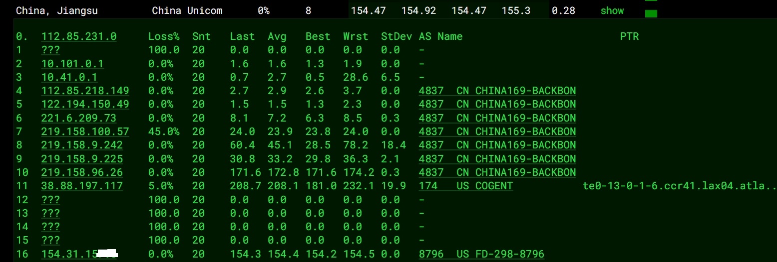 联通回程:直连联通洛杉矶节点之后走cogent去机房