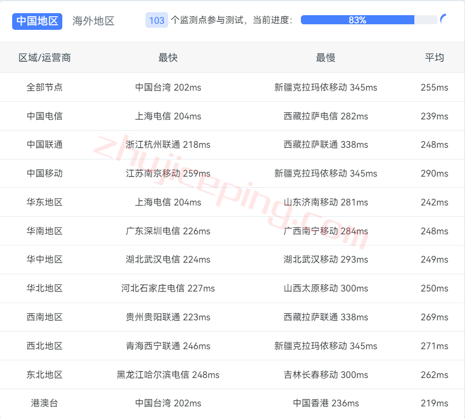 国内三网多节点的延迟测试: