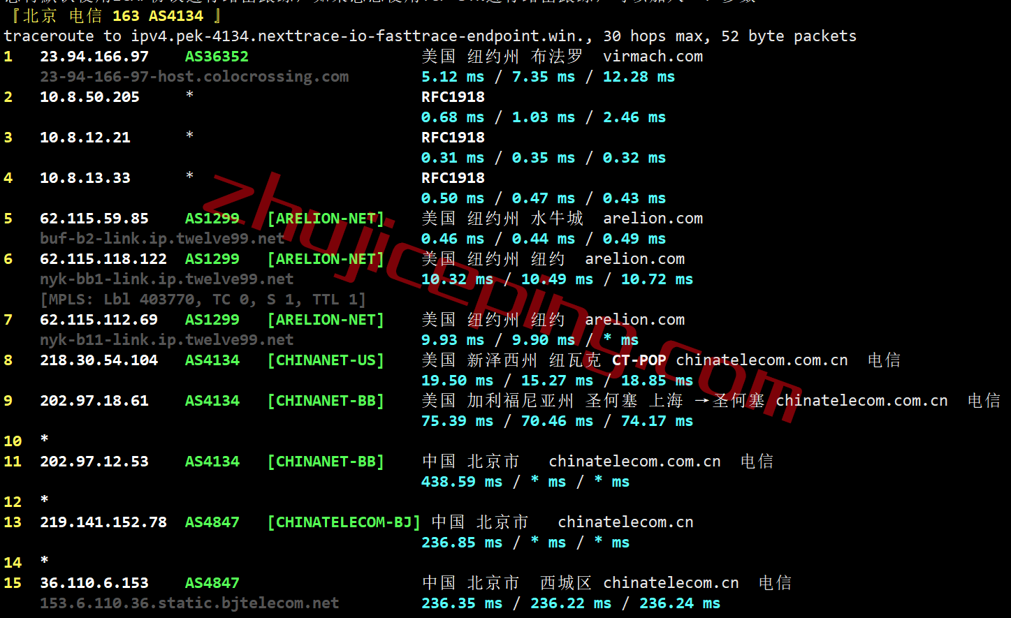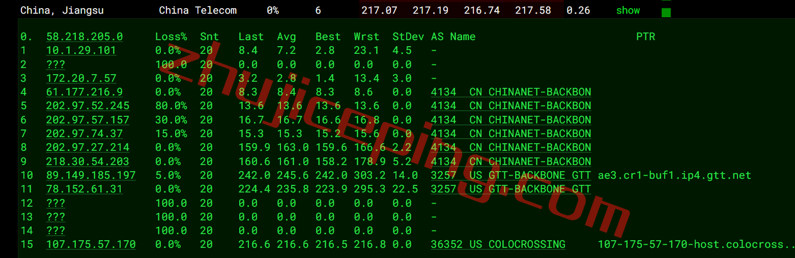 电信去程:直连电信圣何塞节点然后去洛杉矶走GTT去纽约
