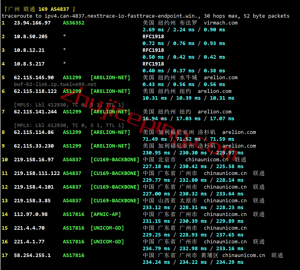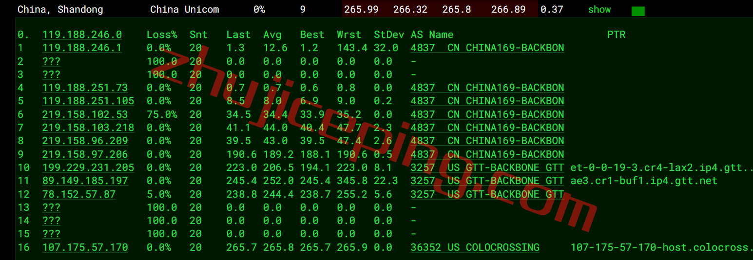 联通去程:直连联通洛杉矶节点然后走GTT去纽约