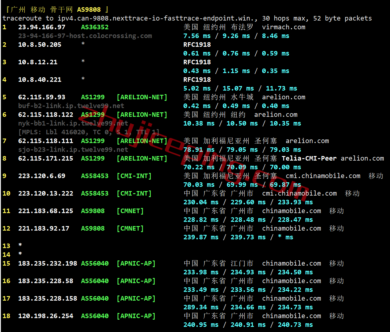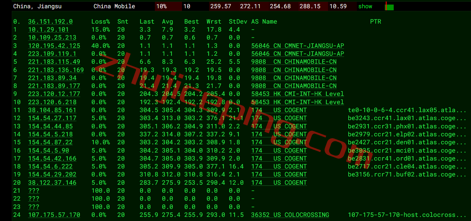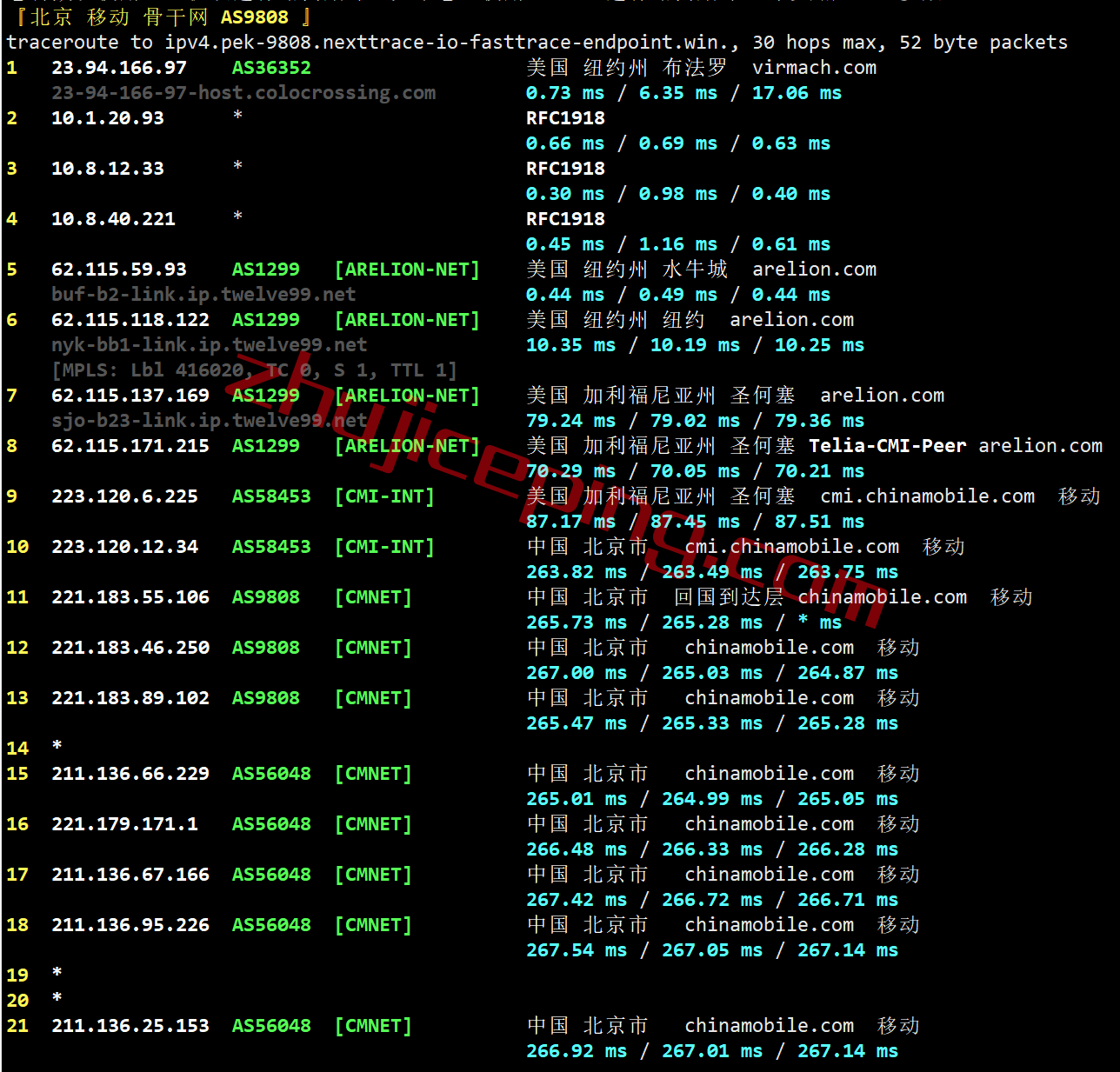移动去程:直连移动洛杉矶节点然后走cogent去纽约