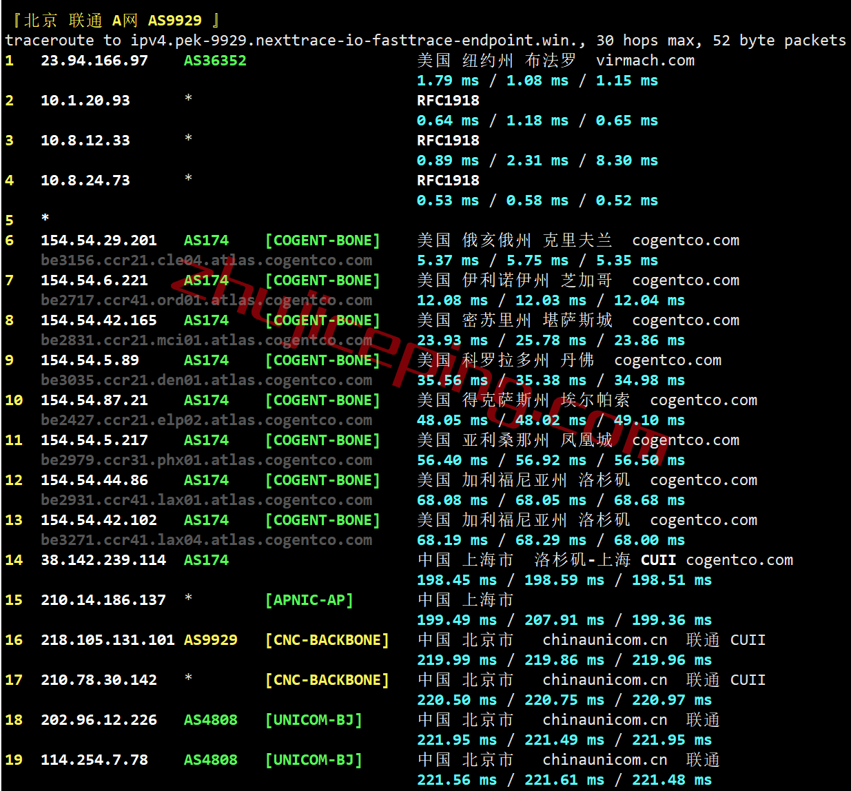 北京方向:走cogent一路横跨美国从西海岸洛杉矶出海回中国