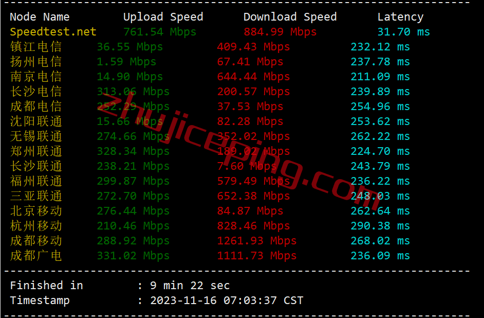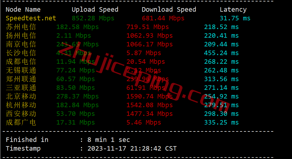 先跑一圈speedtest,看看国内三网多节点的上下行带宽可以冲到多少: