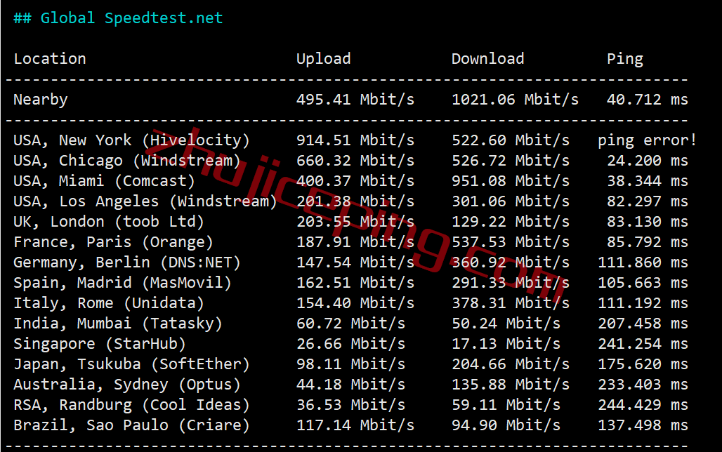 speedtest部分国际节点的大致情况: