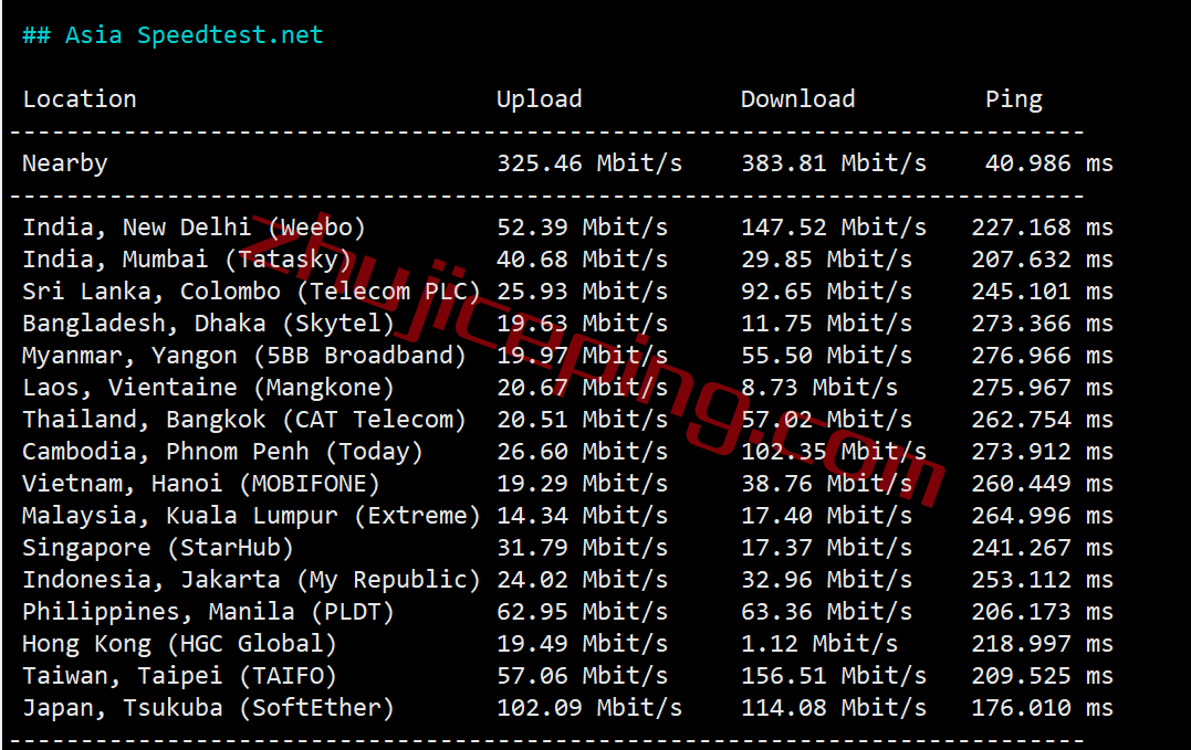 继续测试speedtest亚洲区域内的部分节点,看看数据:
