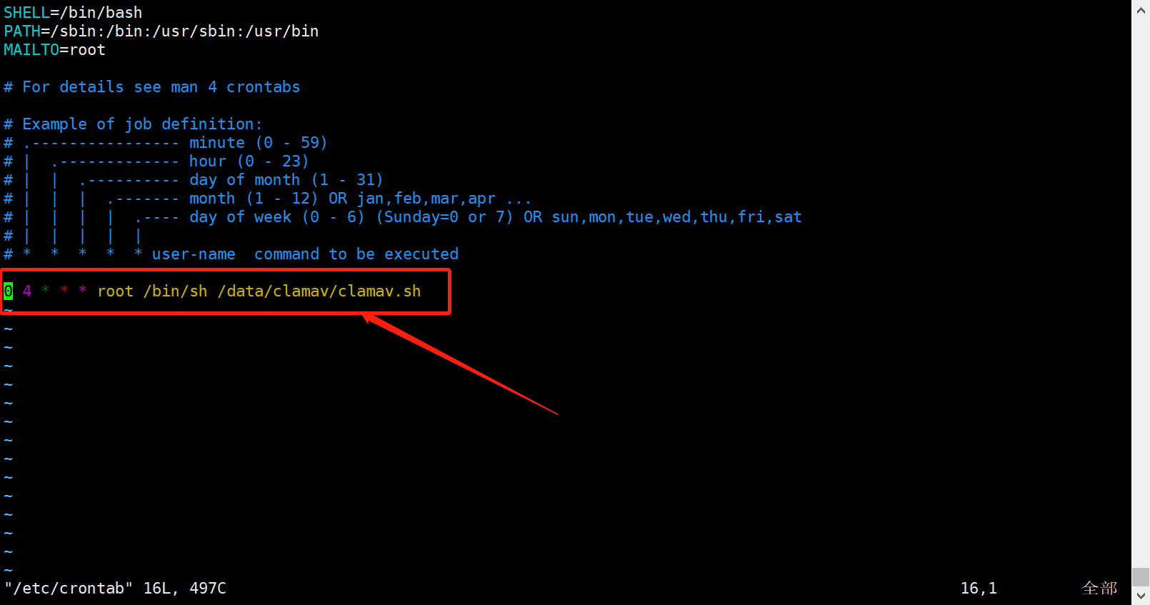 vim /etc/crontab #以用户root身份定时执行脚本,sh为执行命令,/data/----为脚本绝对路径;每天凌晨4点扫描一次 0 4 * * * root /bin/sh /data/clamav/ ###每周日凌晨1点clamav扫描漏洞(扫描根目录推荐) 0 1 * * 7 root /bin/sh /home/clamav/