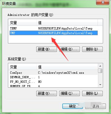 4、环境变量窗口中,选择TMP项,然后点击下方编辑;