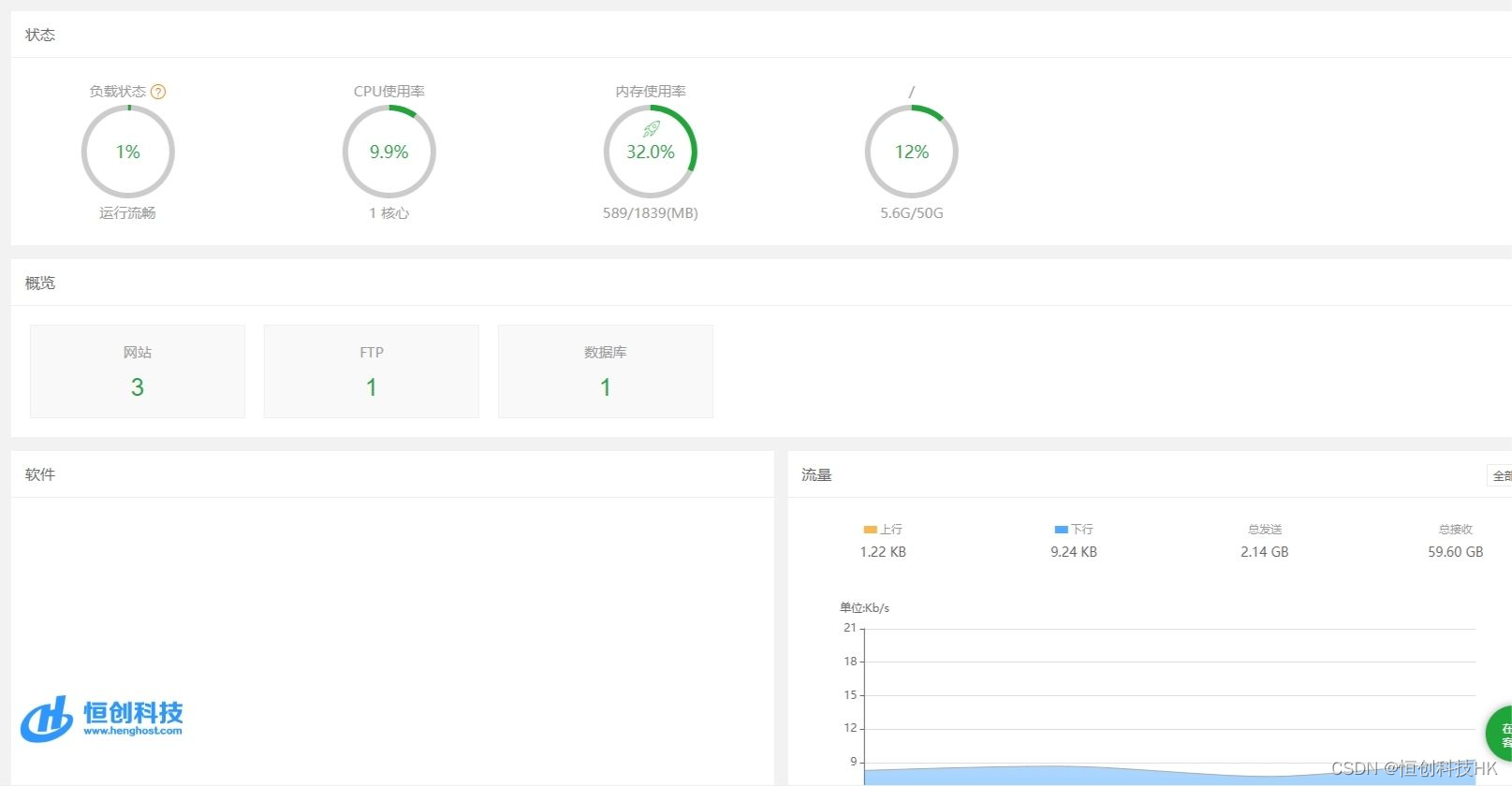 宝塔面板首页为云服务器配置信息:1核2G 50系统盘 网站数量 流量实时监控等。