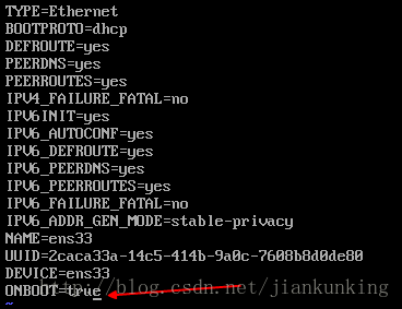 编辑ifcfg-ens33文件的最后一行,将onboot=no改为onboot=yes,,如下图: