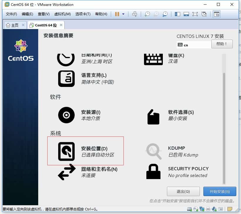 20.软件选择就选择最小安装,其他选项默认,点击开始安装21.点击root密码,为root用户设置密码,如果有需求可以创建新用户