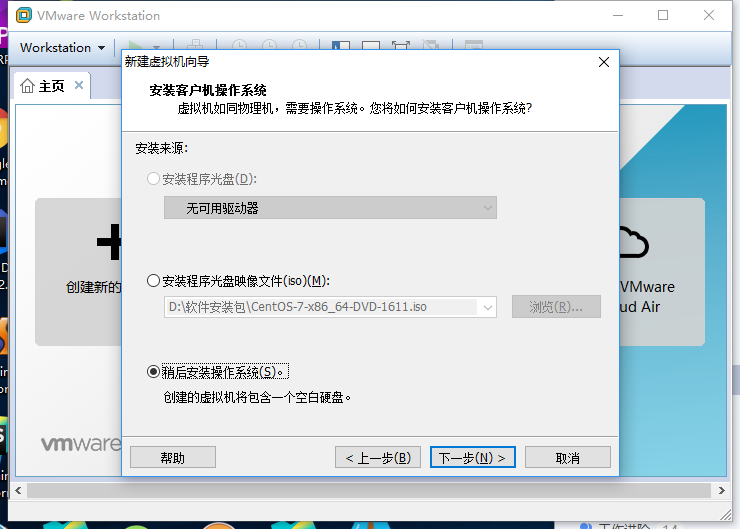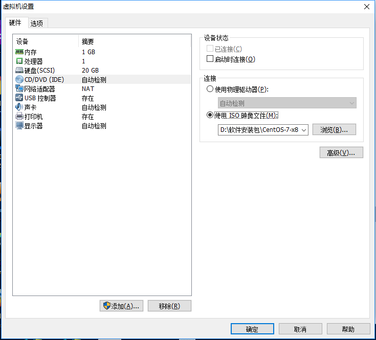 10.选择使用iso映像文件(m),并选择已经下载的centos7的iso文件