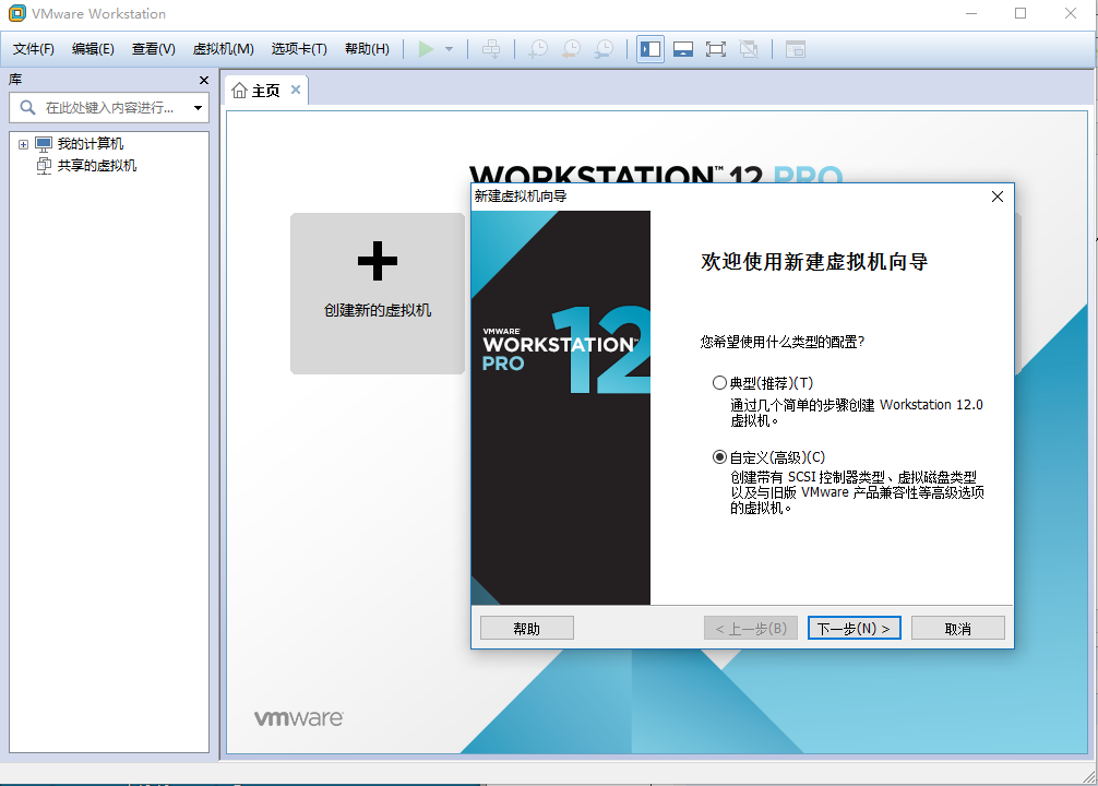 没接触过linux的朋友,建议还是先从虚拟机安装开始。大多使用vmware。这里,我使用的是vmware12。安装完成后如下图,点击创建新的虚拟机,自定义。