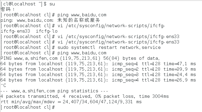 之后使用一下代码重启网络服务,再次使用ping命令,会发现网络已开启。