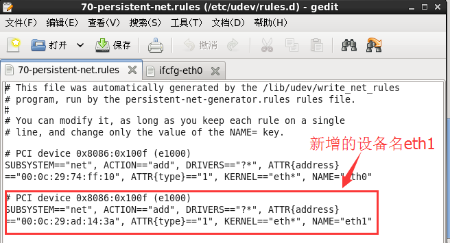 由于克隆后的系统,系统只是修改了虚拟机的名字和mac等,并在/etc/udev/rules.d/70-persistent-net.rules文件中增加了一行名为eth1的设备名