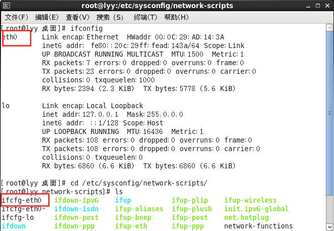 [root@lyy 桌面]# cd /etc/sysconfig/network-scripts //进入网卡配置文件目录