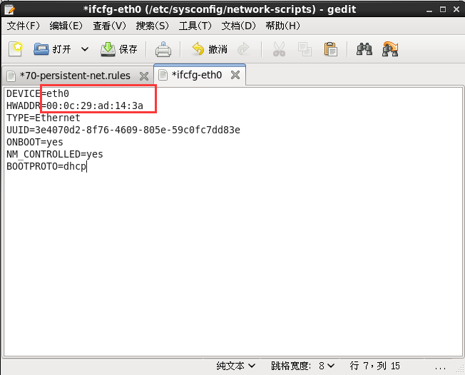 1、修改文件/etc/udev/rules.d/70-persistent-net.rules和/etc/sysconfig/network-scripts/ifcfg-eth0,使得两个文件中的设备名和mac地址相对应