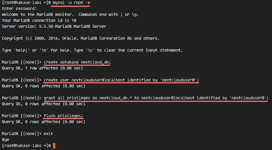 create database nextcloud_db; create user nextclouduser@localhost identified by 'nextclouduser@'; grant all privileges on nextcloud_db.* to nextclouduser@localhost identified by 'nextclouduser@'; flush privileges;