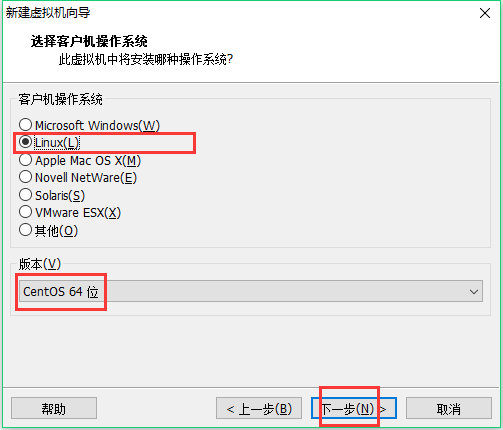 5、选择客户机操作系统为Linux,版本选CentOS 64位(博主的CentOS是64位),下一步